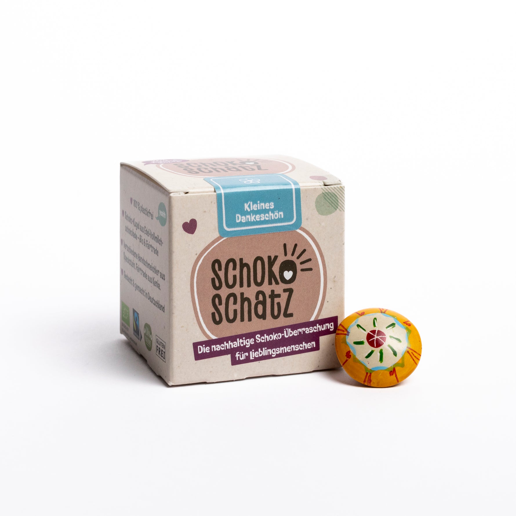 Die faire Schokoladen-Überraschung für Lieblingsmenschen. In der Edition „Kleines Dankeschön“ befindet sich ein Handschmeichler mit Blumenmotiv aus Speckstein.