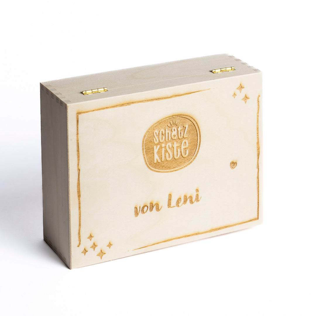 Diese Holzkiste ist die perfekte Schatzkiste für Kinder, kann aber aufgrund des edlen Designs auch ein tolles Geschenk für Erwachsene sein. Wir können z.B: für Brautpaare auch zwei Namen oder individuellen Text gravieren. In die Schatzkiste passen 6 SchokoSchätze (nicht enthalten).