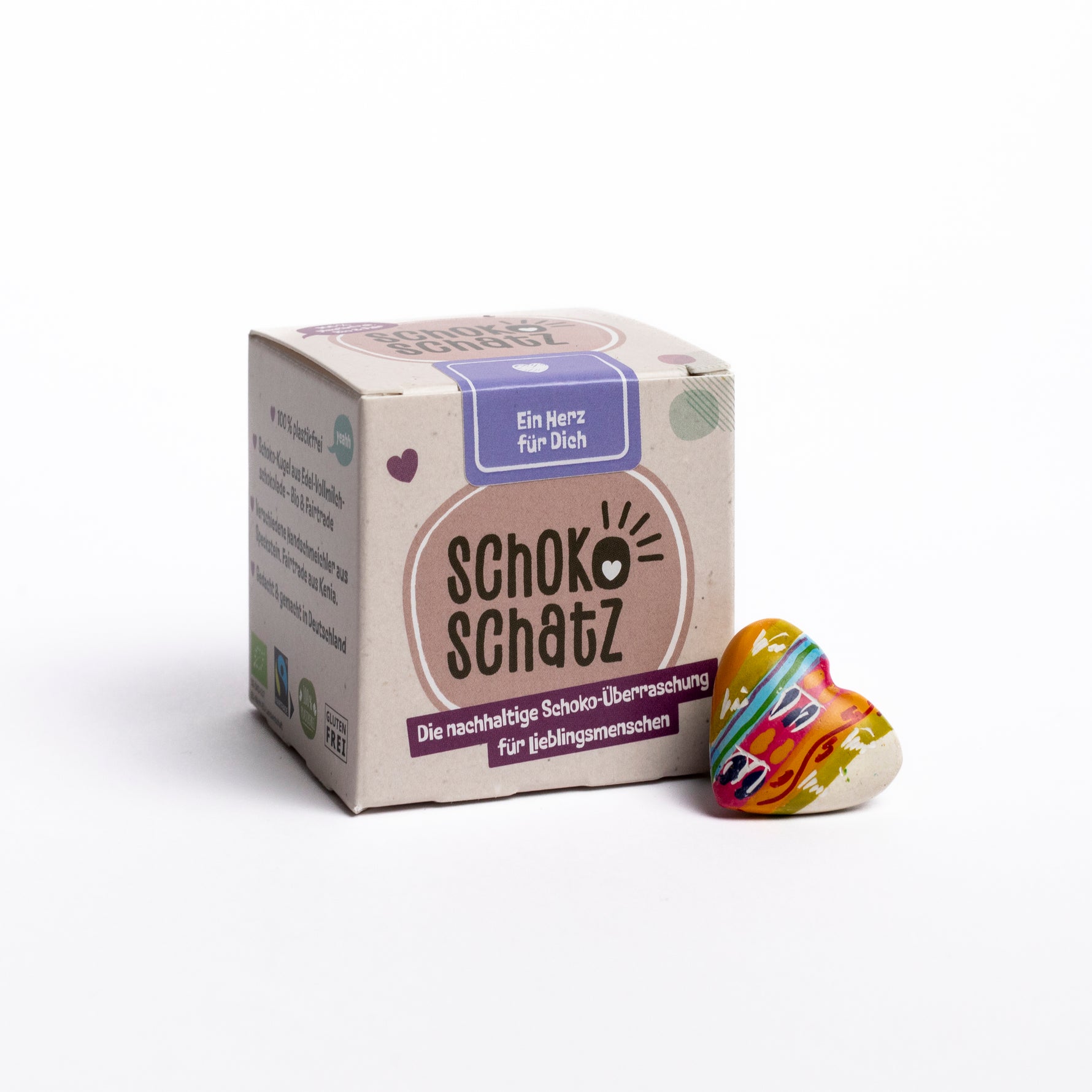 Die faire Schokoladen-Überraschung für Lieblingsmenschen. In der Edition „Ein Herz für Dich“ befindet sich ein kleines handbemaltes Herz aus Speckstein.